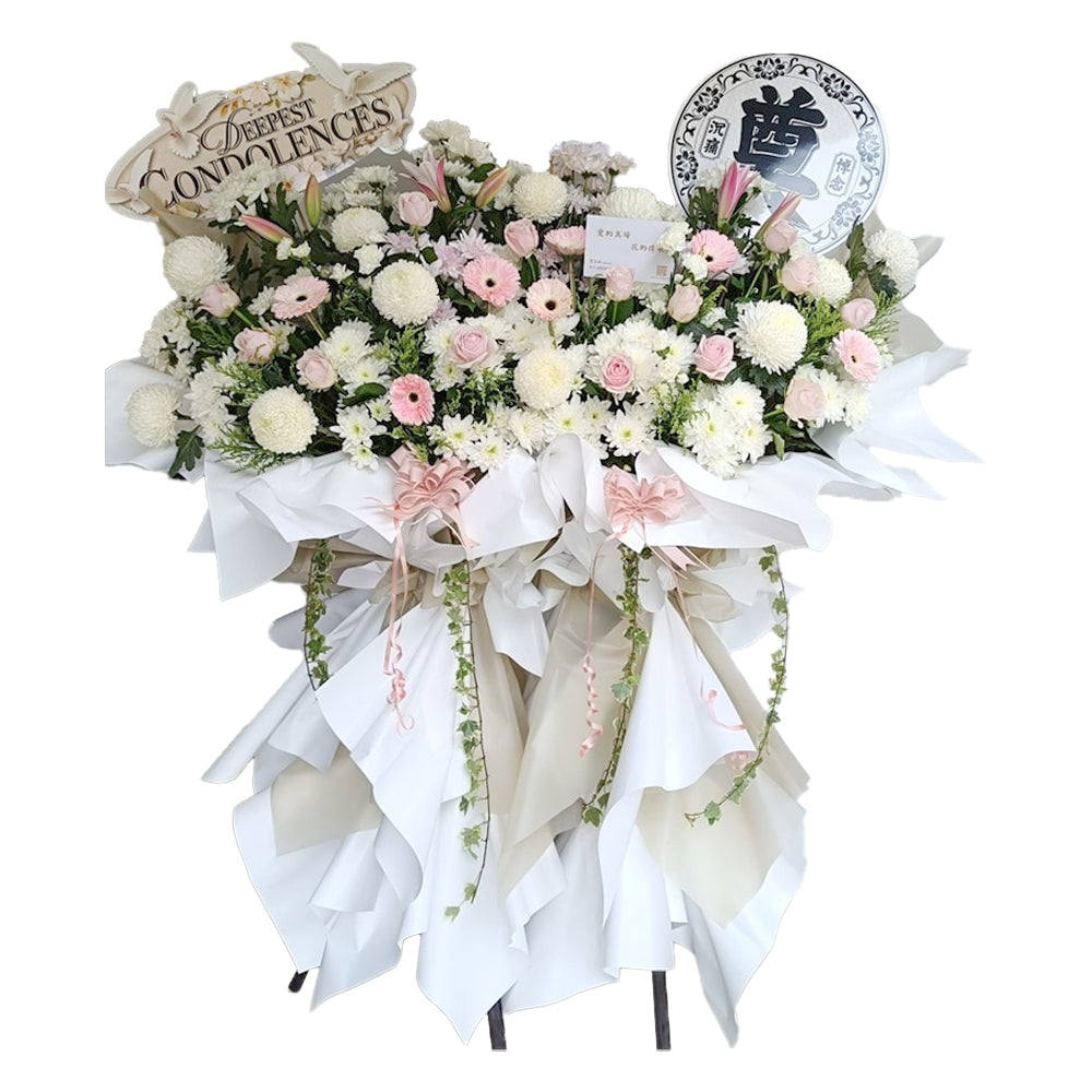 This sympathy flower stand, thoughtfully arranged on two wooden stands, features 10 white Taiwan mum chrysanthemums, 8–10 soft pink blooms, white pompom chrysanthemums, 10 pink roses, and 5 pink lilies — each bloom symbolizing love, purity, and the tender farewell of a cherished soul. The delicate combination of soft pinks and whites, accented with fresh green foliage, creates a serene and peaceful tribute. Included are two Condolences Flower Cards and a Customized Message Card, allowing you to express your deepest sympathies. Finished with elegant plain wrapping paper and a simple ribbon, this arrangement stands as a graceful, heartfelt gesture of comfort and remembrance.